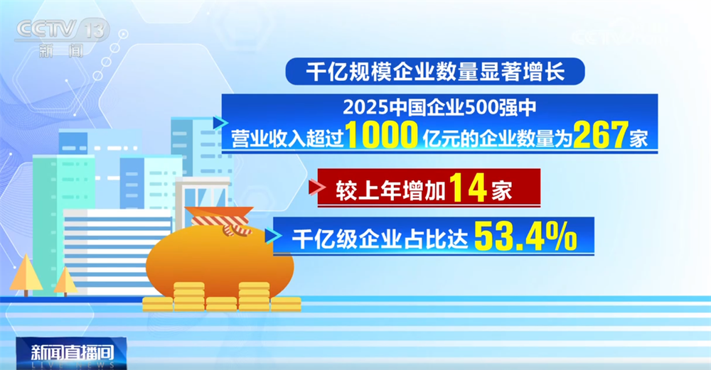 此外,千亿规模企业数量显著增长,2025中国企业500强中,营业收入超过1000亿元的企业数量为267家,较上年增加14家,千亿级企业占比达53.4%。