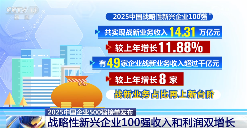 此次同步发布的中国企业500强榜单还包括战略性新兴产业100强等一系列专项榜单。记者注意到,其中,2025中国战略性新兴企业100强的收入和利润均实现增长。