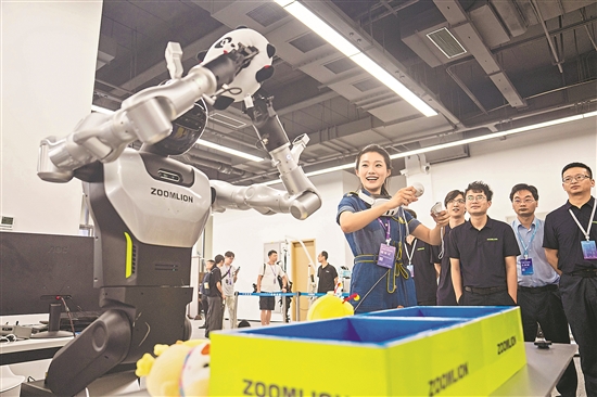 9月15日,在湖南湘江新区长沙智谷,观众操作人形机器人进行娃娃抓取。