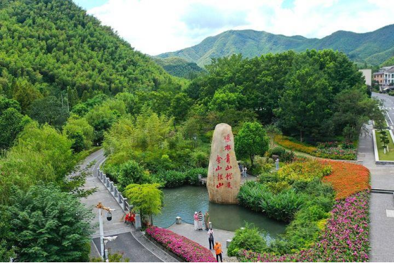 在浙江省湖州市安吉县余村,游客在刻有“绿水青山就是金山银山”的石碑前留影(2025年8月6日摄,无人机照片)。新华社记者 毛竹 摄