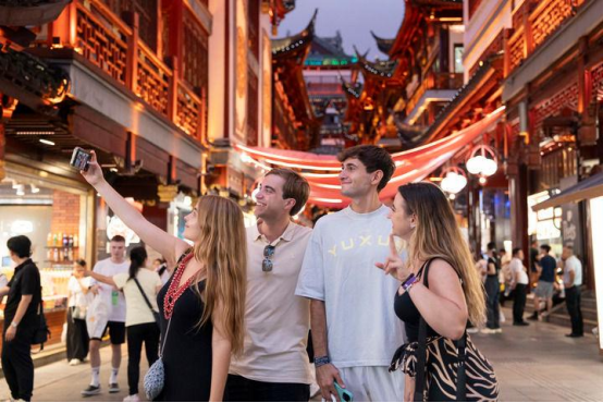 2025年7月21日,西班牙游客在上海豫园商城留影。新华社发(张悦 摄)