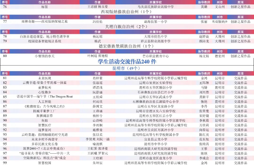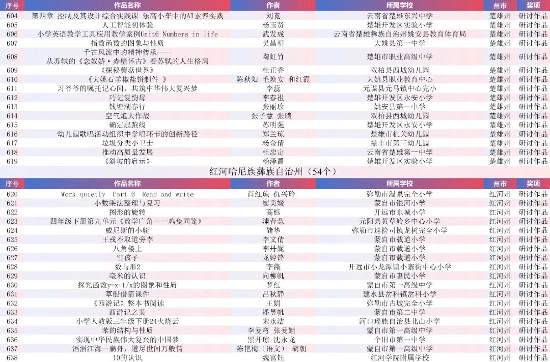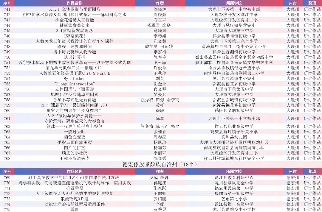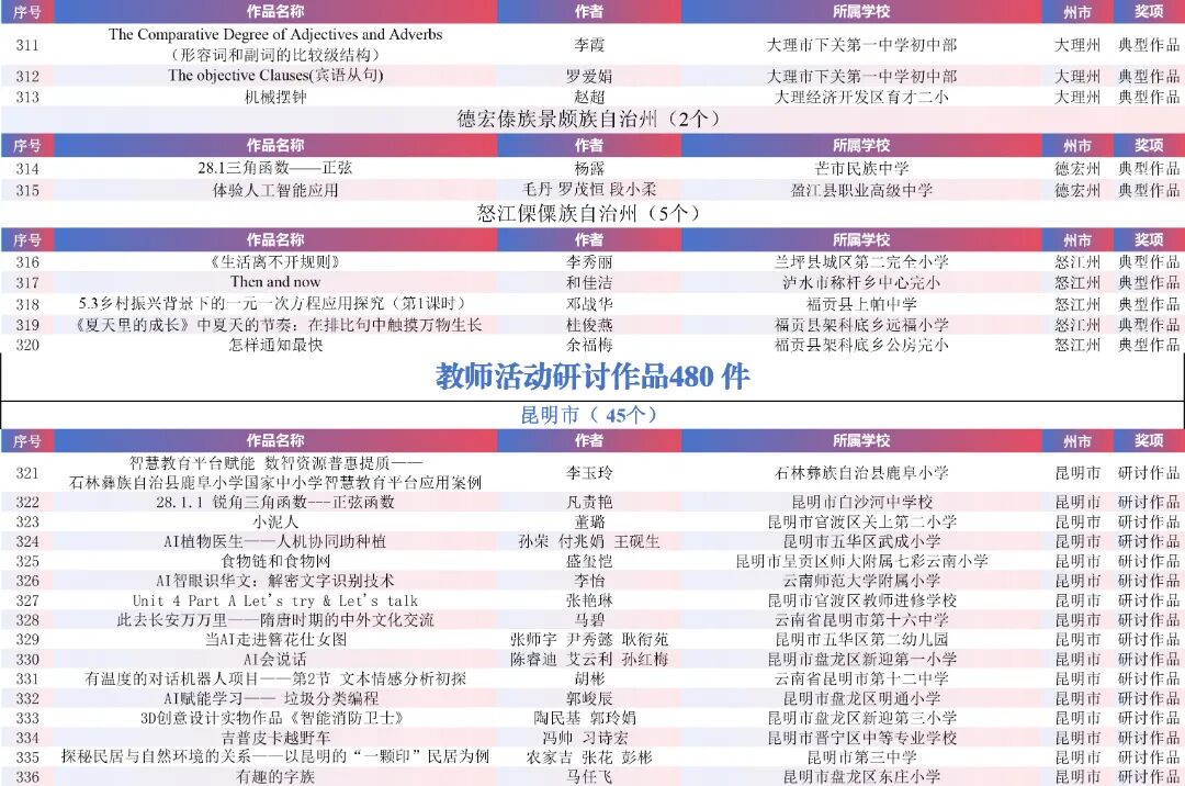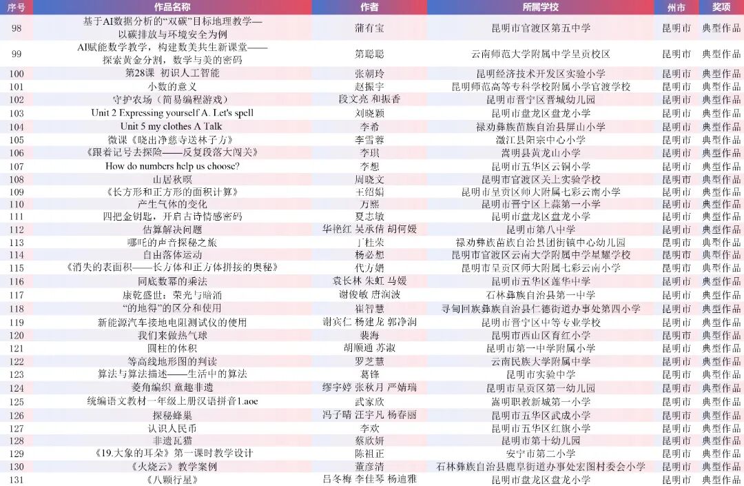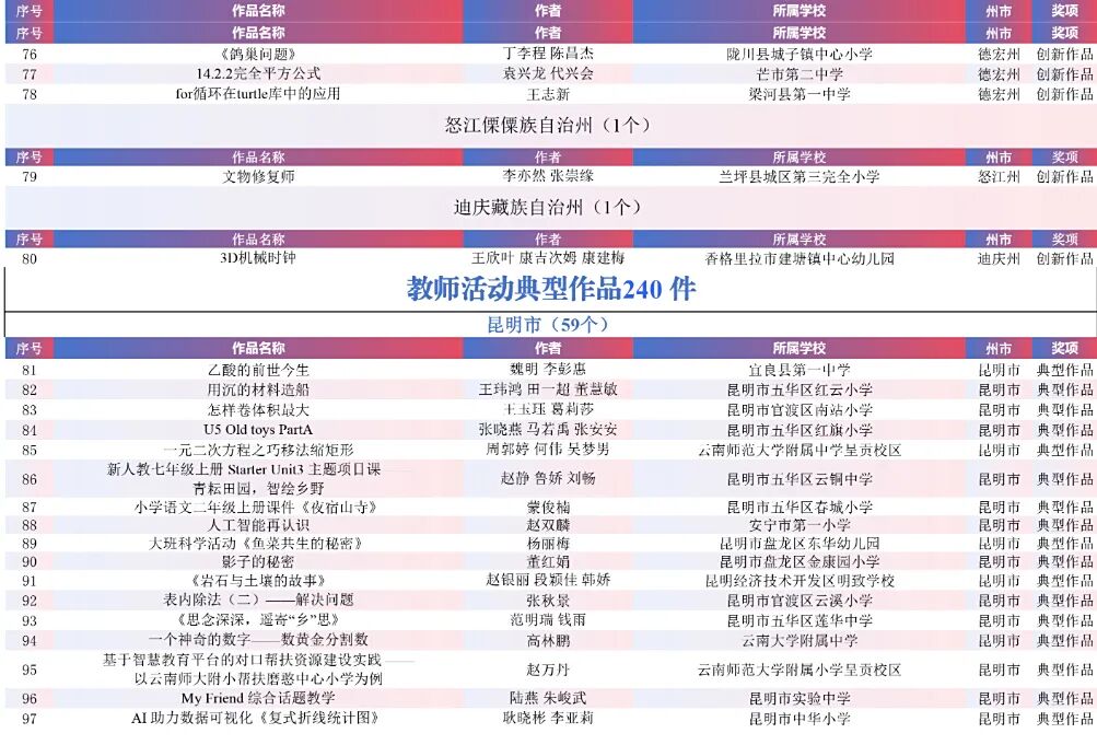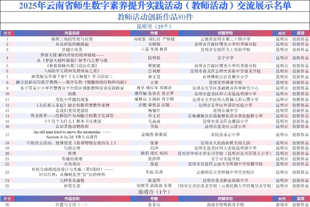 9月15日,云南省教育厅公示了“2025年云南省师生数字素养提升实践活动交流展示名单”。经各州市推荐,专家线上遴选、线下集中复审等,共推荐出教师活动80件创新作品、240件典型作品、480件研讨作品;学生活动80件创新之星作品、240件交流作品、480件参与作品。现将名单予以公示。