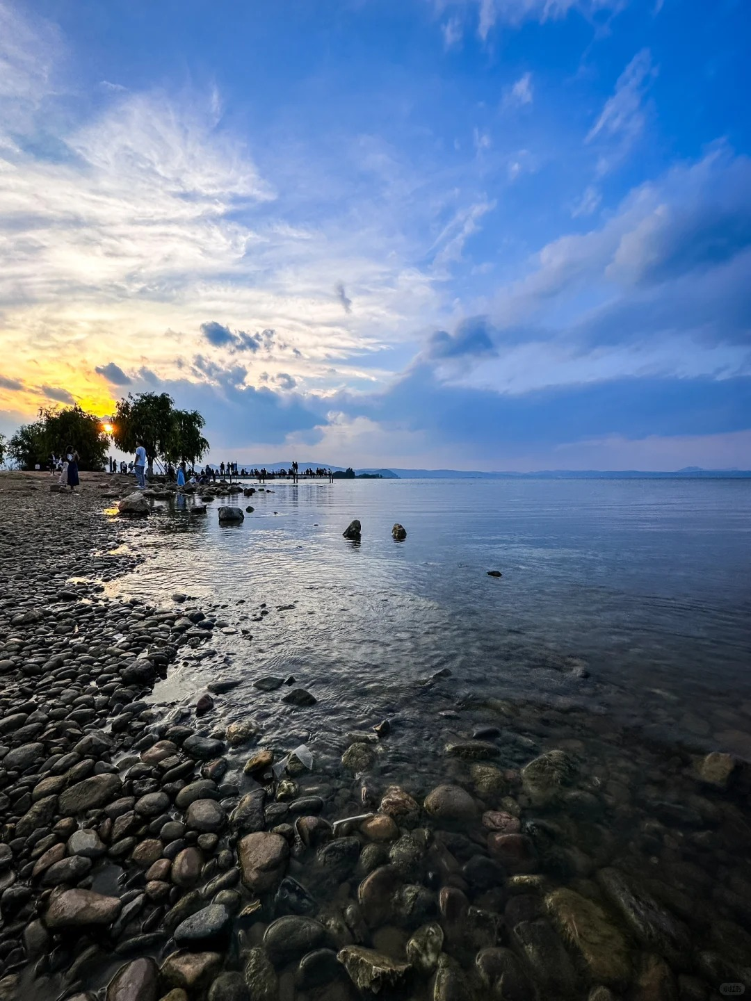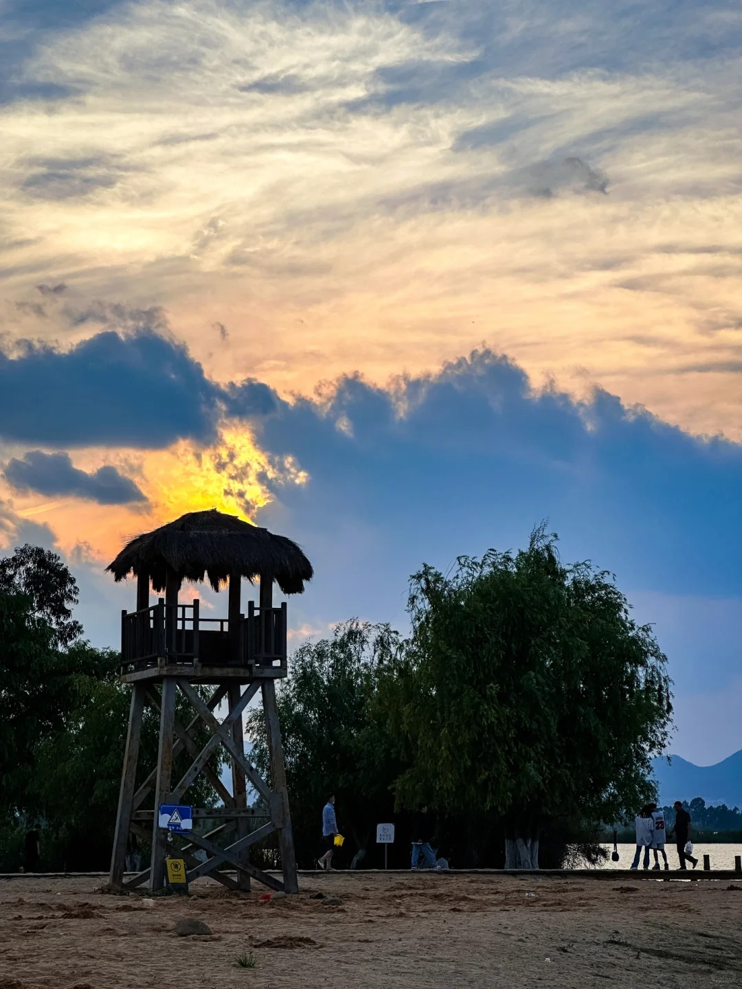 傍晚时分,这里是光与影的剧场。夕阳晕染出橘、粉、靛的渐变天际,人影渐长,与水中的倒影相映成趣。每逢周末,帐篷星星点点散落沙摊,笑语与潮声交织,成为滇池湖畔最治愈的背景音。