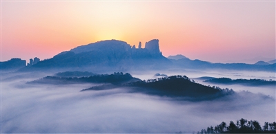 红色是江南丘陵特有的颜色,龟峰拥有这样的热烈,如弋阳高腔般舒展广袖,在世界自然遗产名录里标记上浓墨重彩的一笔。沿着山间道路,渐渐到达山顶,放眼望去,远远近近裸露出的红色掩映在绿色的海洋里。这独一无二的红配绿,仿佛“纷披灿烂,戈矛纵横”的《广陵散》,灵动又在那远古的乐曲之外。我对这片红色土地有着浓厚的感情,人生辗转,几度南北,经历工作单位的变动,却似乎从未走出过丹霞地貌钩织成的经纬网。