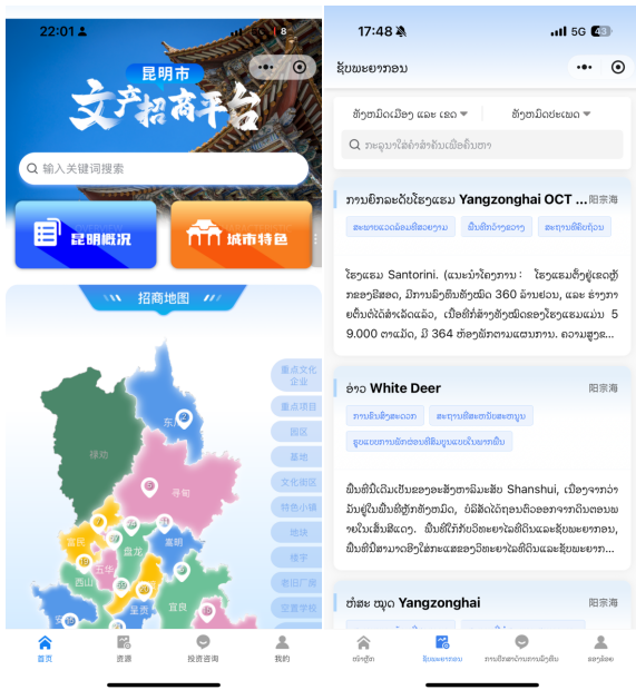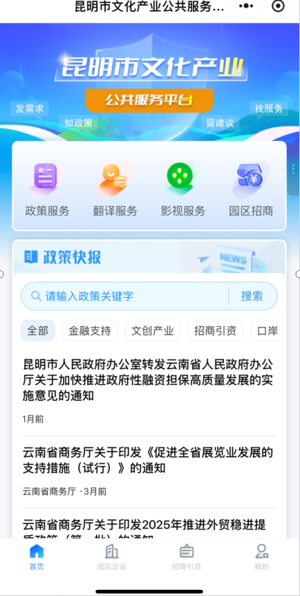 招商引资服务:推出“昆明市文产招商地图”,集成综合资讯、产业布局与项目导览,支持中、英、老挝三语服务,助力国际资源对接与合作;