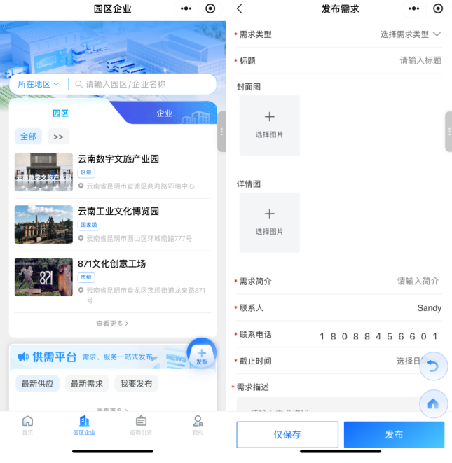 园区企业服务:实现信息一体化管理、名片可视化展示,支持人才招聘、项目发布与活动推广,全面提升资源匹配与合作效率;