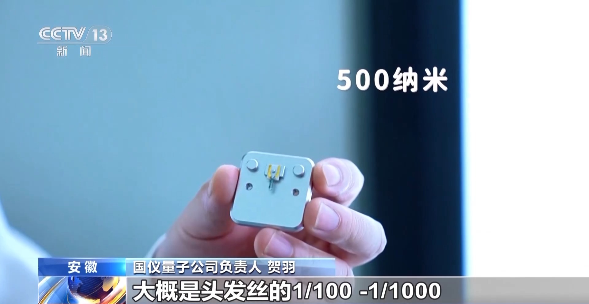 国仪量子公司负责人 贺羽:首先我们是要加工出来一个钻石探针,钻石探针的直径只有500纳米,大概是头发丝的1/100~1/1000,传感器就在探针的针尖上,传感器的尺度只有0.5纳米,0.5纳米又是500纳米的1/1000。