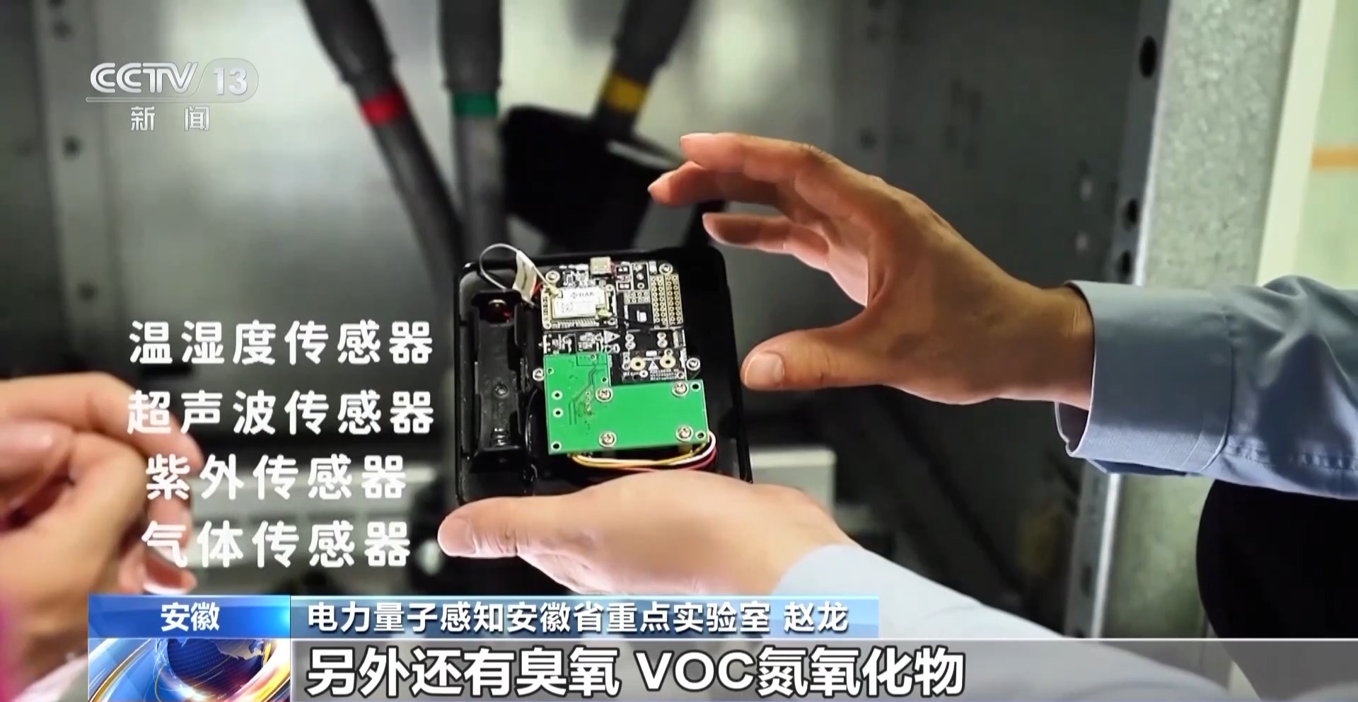 电力量子感知安徽省重点实验室 赵龙:这是我们的量子点多参量传感器,它里面有温湿度传感器,有超声波传感器,有紫外传感器,另外还有臭氧、VOC氮氧化物这种气体传感器,它可以同时多个维度去监测开关柜里面的实时状态,它的灵敏度可以达到0.01个ppm,相当于在一个游轮上去找一粒沙子。
