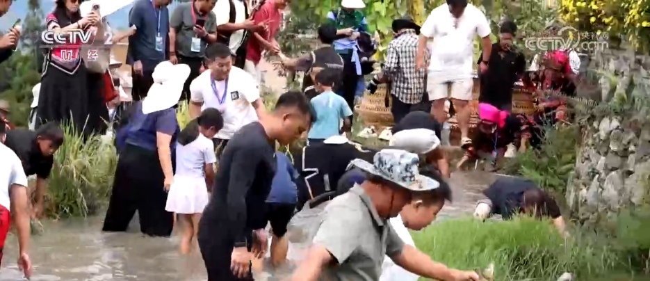 打谷体验意犹未尽,梯田捕鱼区已响起阵阵欢呼。田水中,肥美的梯田鱼穿梭游动,游客们弯腰合围、伸手捕捉,捕获鲜鱼的游客手捧“战利品”,满脸的成就感。