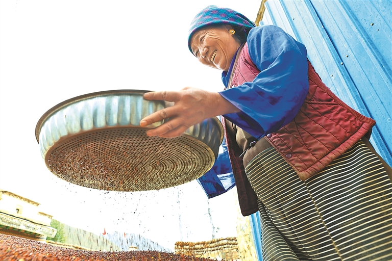 拉萨市墨竹工卡县唐加乡莫冲村村民正在筛菜籽。本报记者 旦增兰泽 本报通讯员 洛克摄