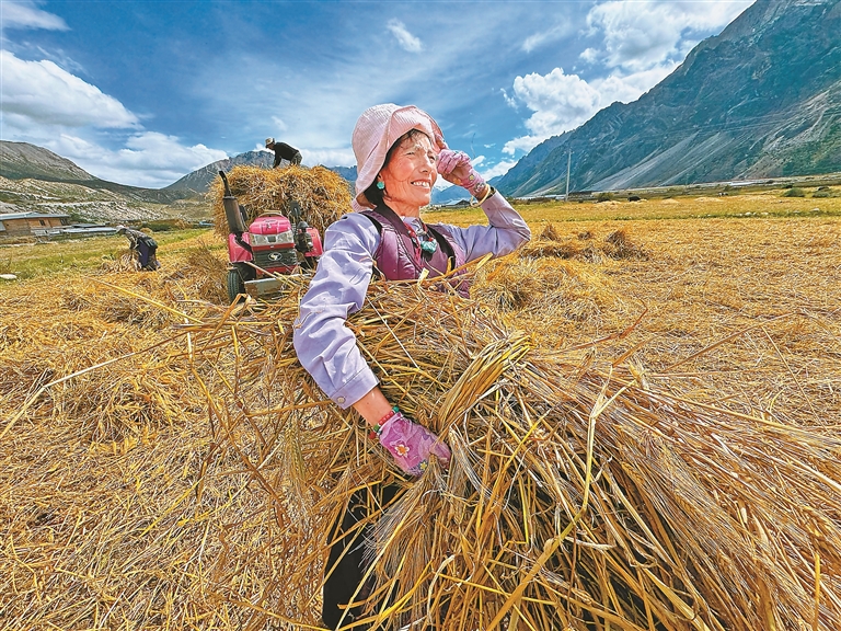 在拉萨市墨竹工卡县唐加乡莫冲村,田间地头繁忙景象扑面而来。几台大型收割机轰鸣着在金色的农田里来回穿梭,收割、脱粒一气呵成,村民们跟在机器后方,有条不紊地进行后续整理工作,呈现出一派热火朝天的丰收场景。村民贡嘎顿玉向记者介绍,“我家共有37亩农田,10亩种小油菜,27亩种青稞。以前全家4口上阵得忙上一个多月,现在有了机械化作业,短短几天就能完成所有秋收工作,既省时又省力。”