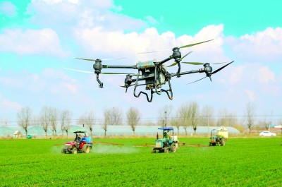 青岛莱西市沽河街道的植保无人机在对小麦进行管护。张进刚摄/光明图片