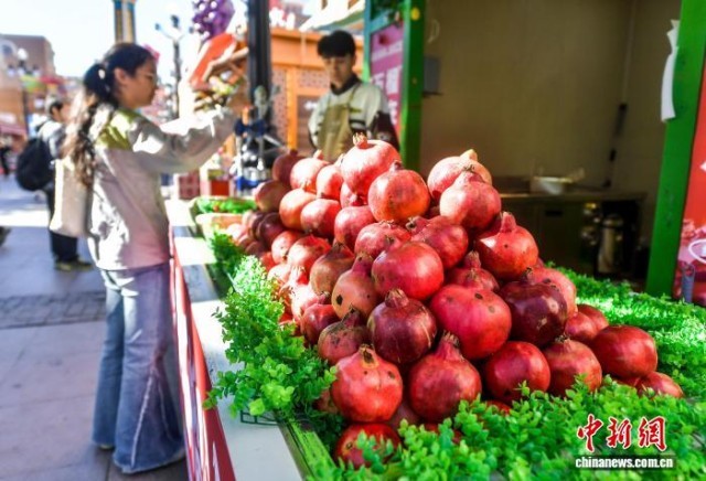 9月22日,新疆乌鲁木齐市大巴扎步行街,游客选购鲜榨石榴汁。秋季到来,新疆各地旅游市场依然火热,各大景区景点游客数量持续高位运行。数据显示,2024年新疆共接待国内外游客3.02亿人次,2025年“热度”不减,1至8月接待游客2.3亿人次。中新社记者 刘新 摄