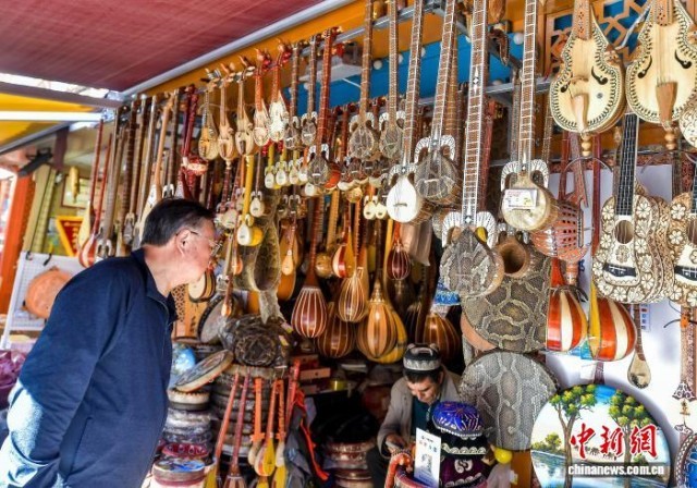 9月22日,新疆乌鲁木齐市大巴扎步行街,各种新疆乐器吸引游客。秋季到来,新疆各地旅游市场依然火热,各大景区景点游客数量持续高位运行。数据显示,2024年新疆共接待国内外游客3.02亿人次,2025年“热度”不减,1至8月接待游客2.3亿人次。中新社记者 刘新 摄