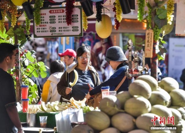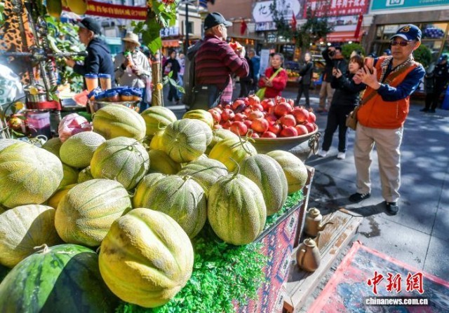 9月22日,新疆乌鲁木齐市大巴扎步行街,新疆各类地产水果吸引游客。秋季到来,新疆各地旅游市场依然火热,各大景区景点游客数量持续高位运行。数据显示,2024年新疆共接待国内外游客3.02亿人次,2025年“热度”不减,1至8月接待游客2.3亿人次。中新社记者 刘新 摄