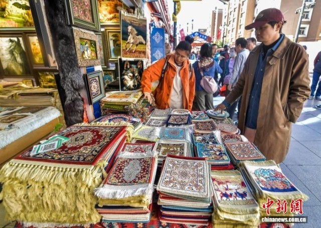9月22日,新疆乌鲁木齐市大巴扎步行街,游客选购手工织毯。秋季到来,新疆各地旅游市场依然火热,各大景区景点游客数量持续高位运行。数据显示,2024年新疆共接待国内外游客3.02亿人次,2025年“热度”不减,1至8月接待游客2.3亿人次。中新社记者 刘新 摄
