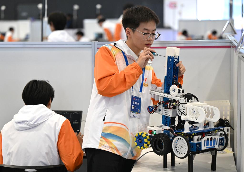 工作人员在调试智能网联汽车装调运维项目比赛用车。