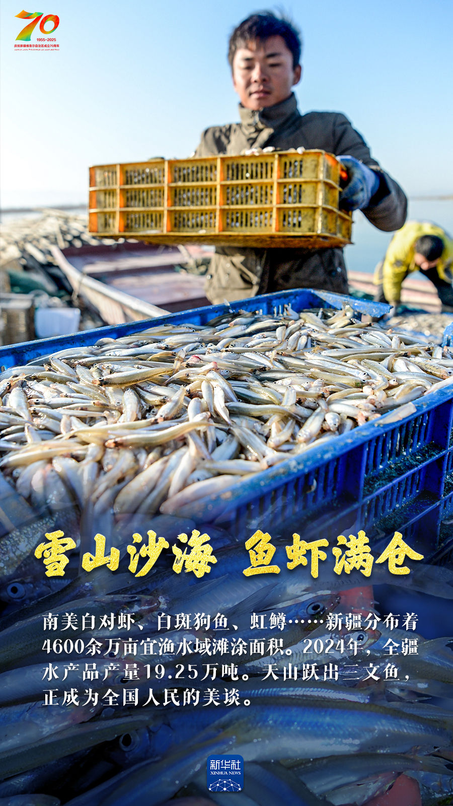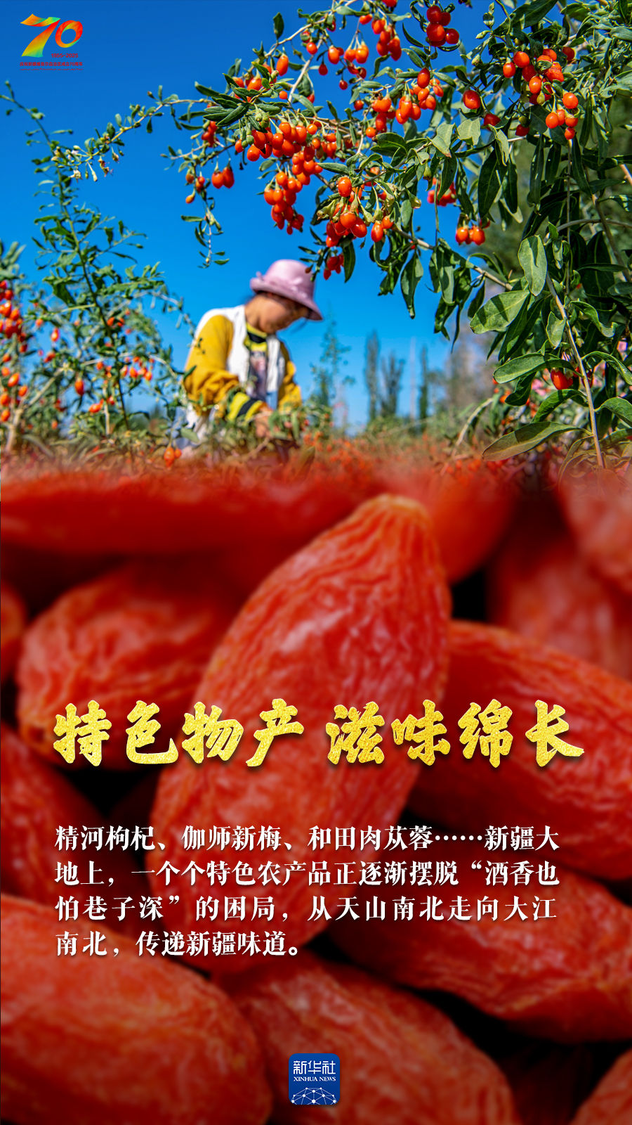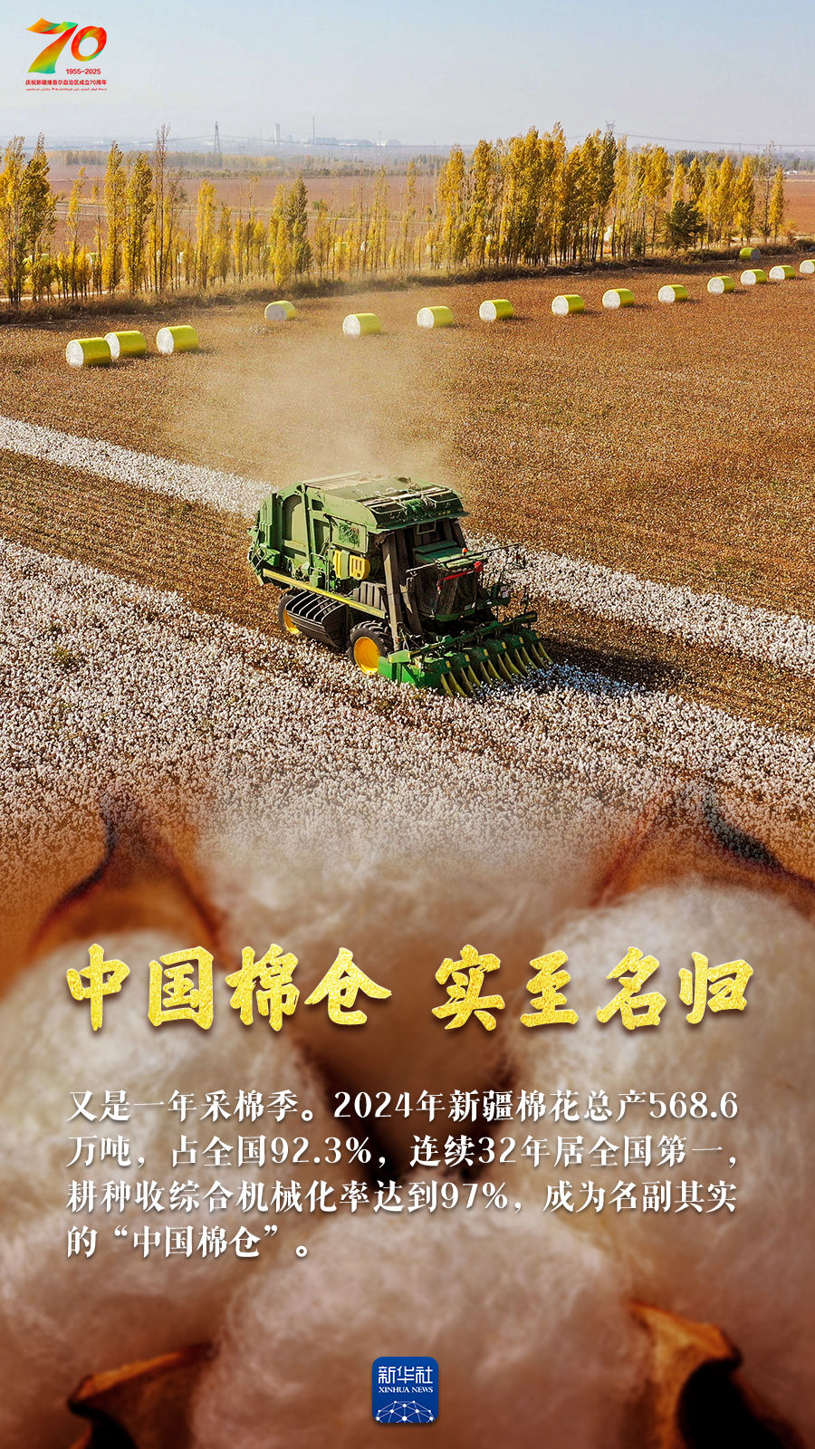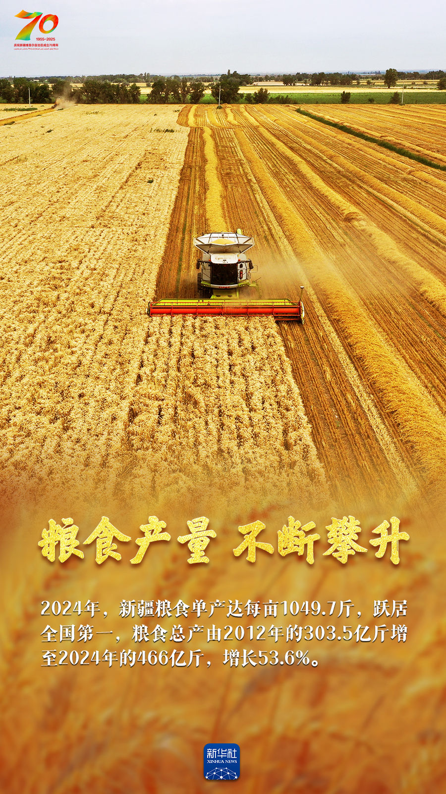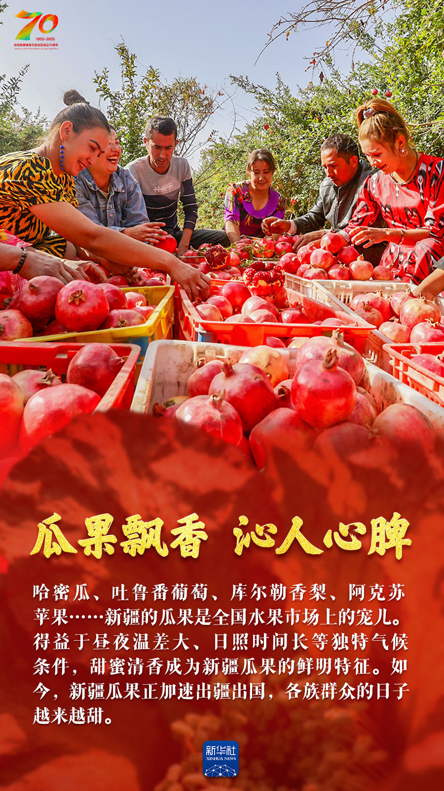 正是丰收好光景,天山南北仓廪实。今年是新疆维吾尔自治区成立70周年,70年来新疆农业生产发生了翻天覆地的变化:人均口粮从不足200公斤到粮食单产跃居全国第一;棉花占全国总产量的比重超过九成;离海最远的新疆成为多种海鲜出口地;皮亚曼的石榴、吐鲁番的葡萄、库尔勒的香梨、阿克苏的苹果……更是甜醉了全国人民的味蕾。让我们跟随这组海报,领略丰收里的大美新疆。