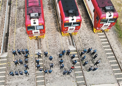 八月十九日,在肯尼亚内罗毕非洲之星铁路运营有限责任公司机务运转整备场,中肯两国铁路工作者在机车前站列并组成“3000”字样,以纪念蒙内铁路实现安全运营三千天。新华社记者 杨 光摄