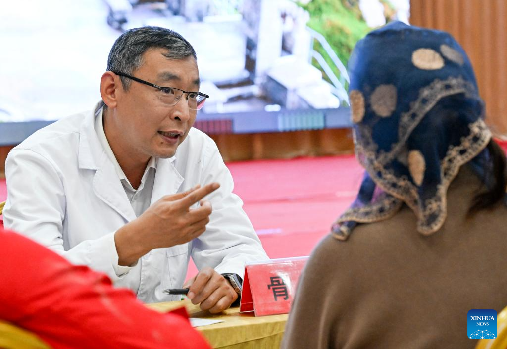 A doctor from Tiemenguan City conducts free clinical treatment to a local villager in Daxi Village of Yuli County, Mongolian Autonomous Prefecture of Bayingolin, northwest China's Xinjiang Uygur Autonomous Region, Sept. 19, 2025. People in Daxi Village of Yuli County used to live a poor life due to the harsh natural environment and limited means of living. In recent years, local authorities have made efforts to develop tourism and e-commerce to promote rural development, which has brought more income for local villagers. (Xinhua/Wang Fei)