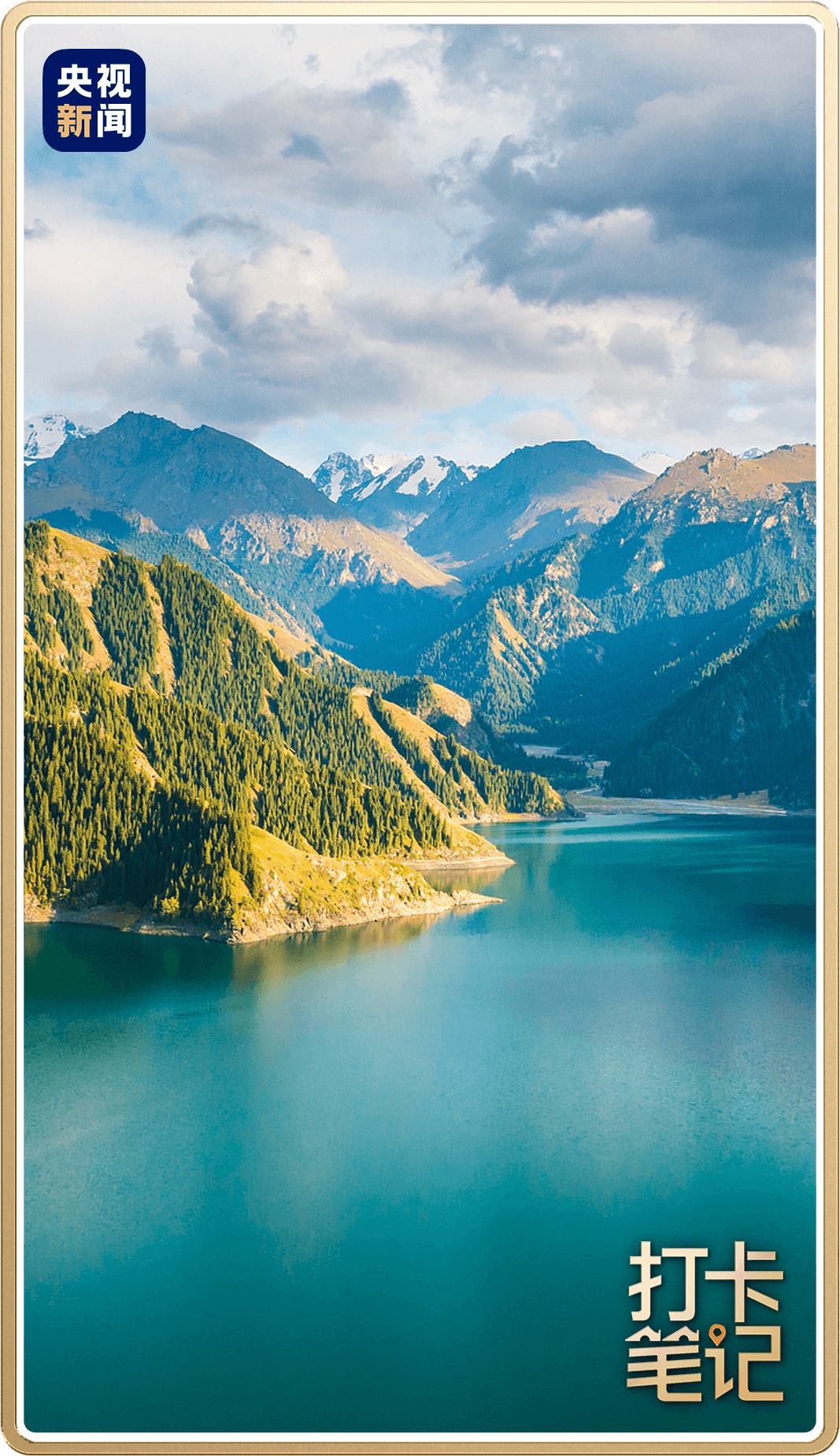 昌吉阜康市境内的天山天池波光粼粼,是博格达雪山的冰川湖泊。远处雪峰倒映在池水中,湖光山色浑然一体。