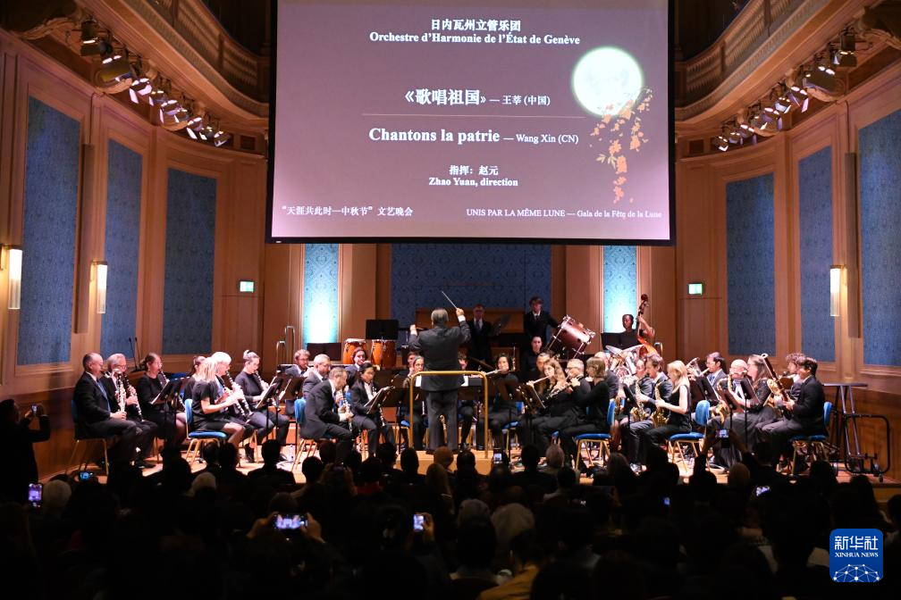 由瑞士伯尔尼中国文化中心主办的2025年“天涯共此时——中秋节”文艺晚会23日晚在日内瓦举行。来自杭州歌剧舞剧院“西子国乐”民乐团和瑞士日内瓦州立管乐团的音乐家们为现场观众献上了一场中西合璧的精彩演出,共同庆祝中华人民共和国成立76周年和中秋佳节。(新华网 新华社记者 连漪 摄)