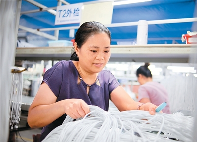 湖南省邵阳市城步苗族自治县推出税收优惠等一揽子政策,促进群众就业。图为工人在当地一家企业赶制数据线产品。严钦龙摄(人民视觉)