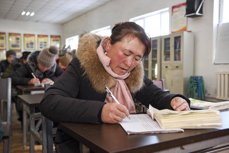 在新疆农业广播电视学校昭苏县分校巴尔格勒津村教学点,42岁的牧民古力巴哈提·斯拉木霍加在复习动物卫生防疫技术课的知识点(2018年1月22日摄)。2019年4月,她和班上的44名同学将拿到畜牧兽医专业的中专毕业证,有望得到新的就业机会。