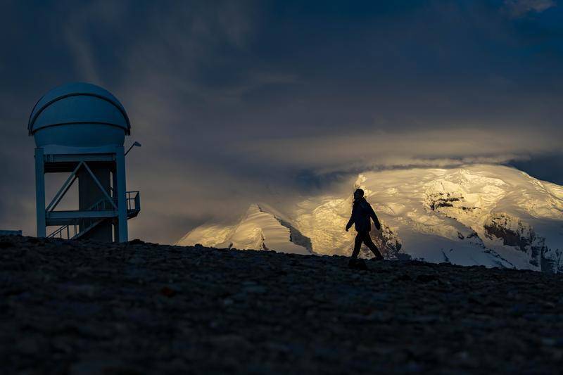 天文科技工作者冯国杰在中国科学院新疆天文台慕士塔格观测站内巡查(2020年6月15日摄)。