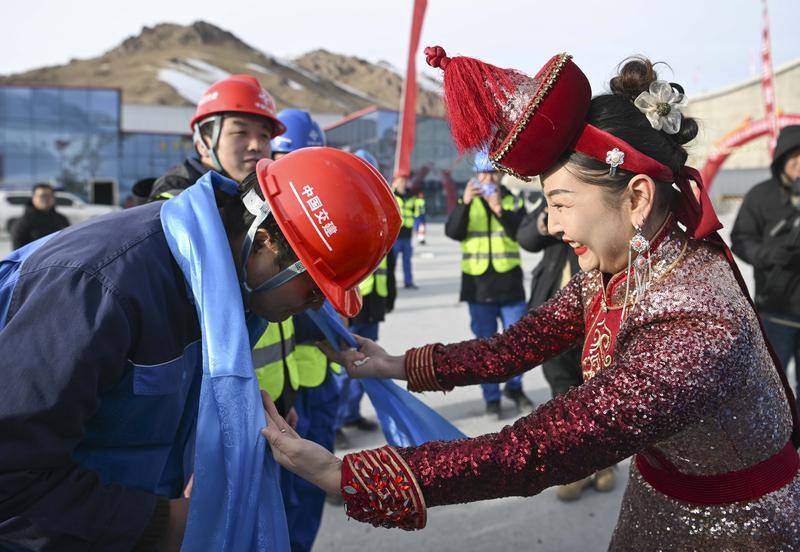 在位于新疆和静县的天山胜利隧道出口,和静县乌兰牧骑队演员(右)向施工方代表敬献哈达(2024年12月30日摄)。当日,世界上最长的高速公路隧道——天山胜利隧道全线贯通。