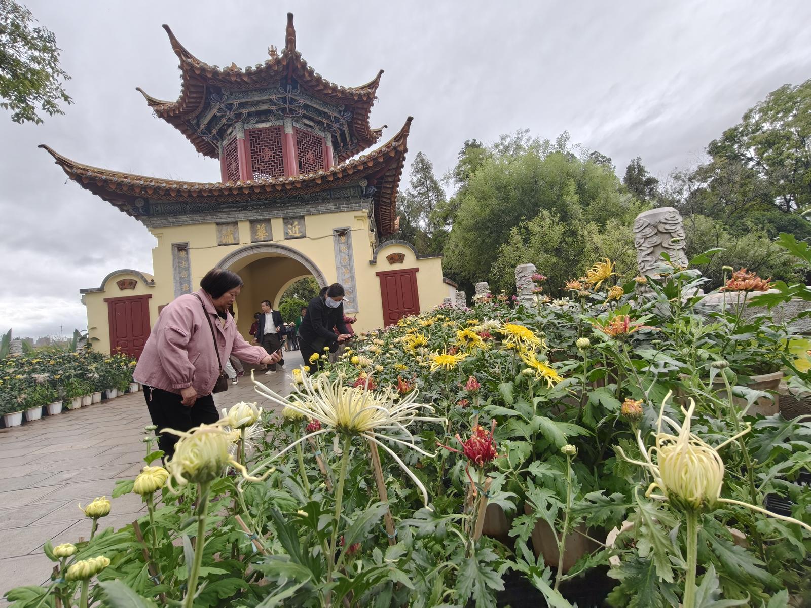 29日上午,记者来到昆明市大观公园,一进入公园,发现到处都是各种各样的菊花,有的初开,有的打蕾,给人一种花开盛世之美感。在近华浦,这里是菊花的集中展示区,近华浦主路临水一侧的草坪花架上陈列超过1.3米的悬崖菊,菊枝披垂、如瀑倾泻,形成一道绚丽夺目的菊花瀑布,极具视觉冲击力。在催耕馆内,集中展示12盆菊花盆景,创新融合菊花栽培与盆景艺术,涵盖大型树桩、丛林式、文人树及图案式等多种盆景类型,通过盆景技法对菊花进行整形修剪,探索菊花艺术表现新形式。近华浦门洞出口处则设置寓意祥瑞的菊艺小品,融合鲜艳色彩与喜庆元素,营造出浓厚的节庆氛围。