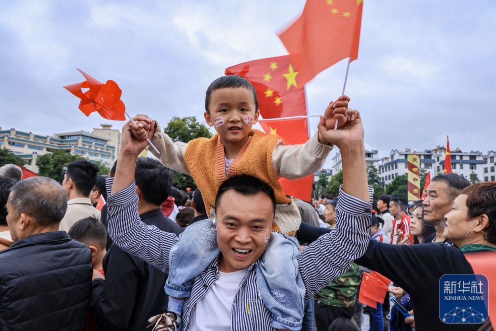 ↑ 10月1日,一对父子在云南省曲靖市麒麟区南城门广场观看升旗。新华社发(孙文来摄)
