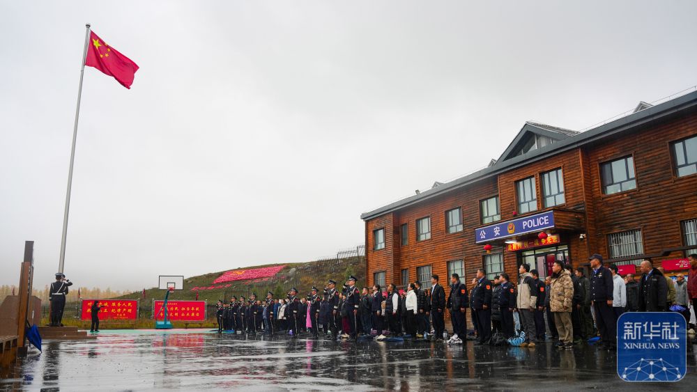 ↑ 10月1日在新疆阿勒泰边境管理支队喀纳斯边境派出所拍摄的升旗仪式。新华社发(王友波摄)