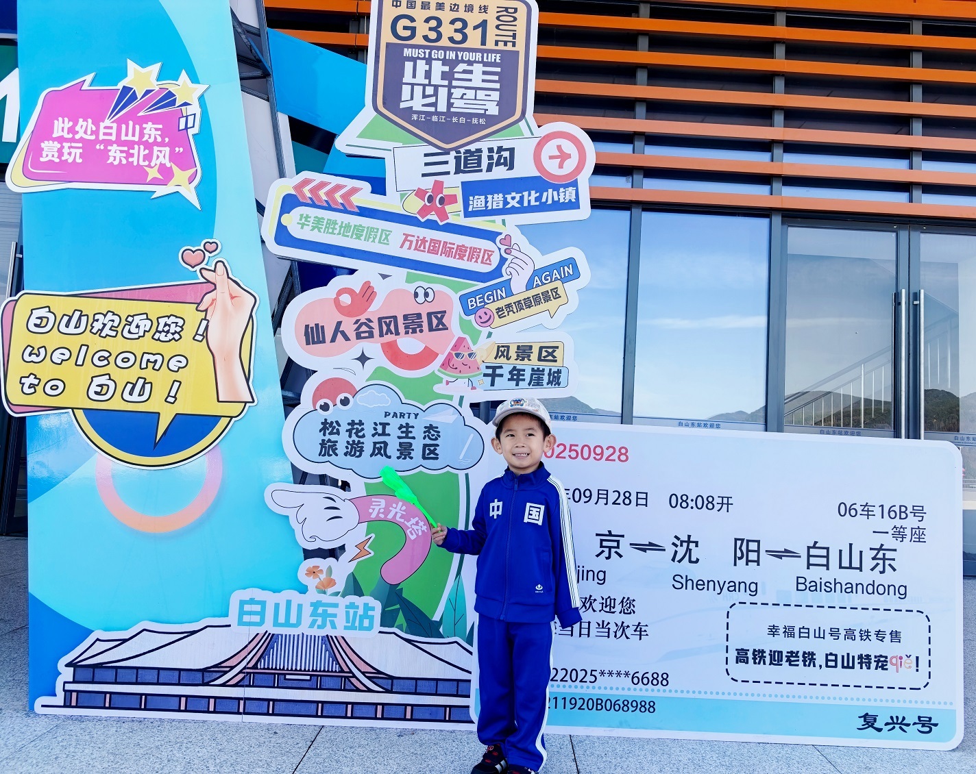 图为9月27日橡果小朋友在白山东站出站口处的打卡照片。旅程的序章始于前一日。9月27日清晨,我刚跑完一场半程马拉松,休息片刻,便载着橡果骑上山地自行车,从家门口出发,沿北安大街缓缓前行。11.37公里的路程,没有匆忙的赶路,只有秋风里的惬意与儿子雀跃的呢喃,最终顺利抵达白山东站。按相关规定,不满六周岁的橡果本可免票,但我还是特意为他买下人生中第一张半价火车票(2025年10月1日起,纸质火车票将正式退出历史舞台,所以,这也是他人生中唯一的一张纸质火车票)——这张小小的粉色票根,是他成长的纪念,更是属于父子俩的专属仪式。购完票后,我们在还未正式运营的白山东站站牌下、候车厅前拍了一张又一张打卡合影,镜头里的笑容,成了出发前最温暖的注脚。