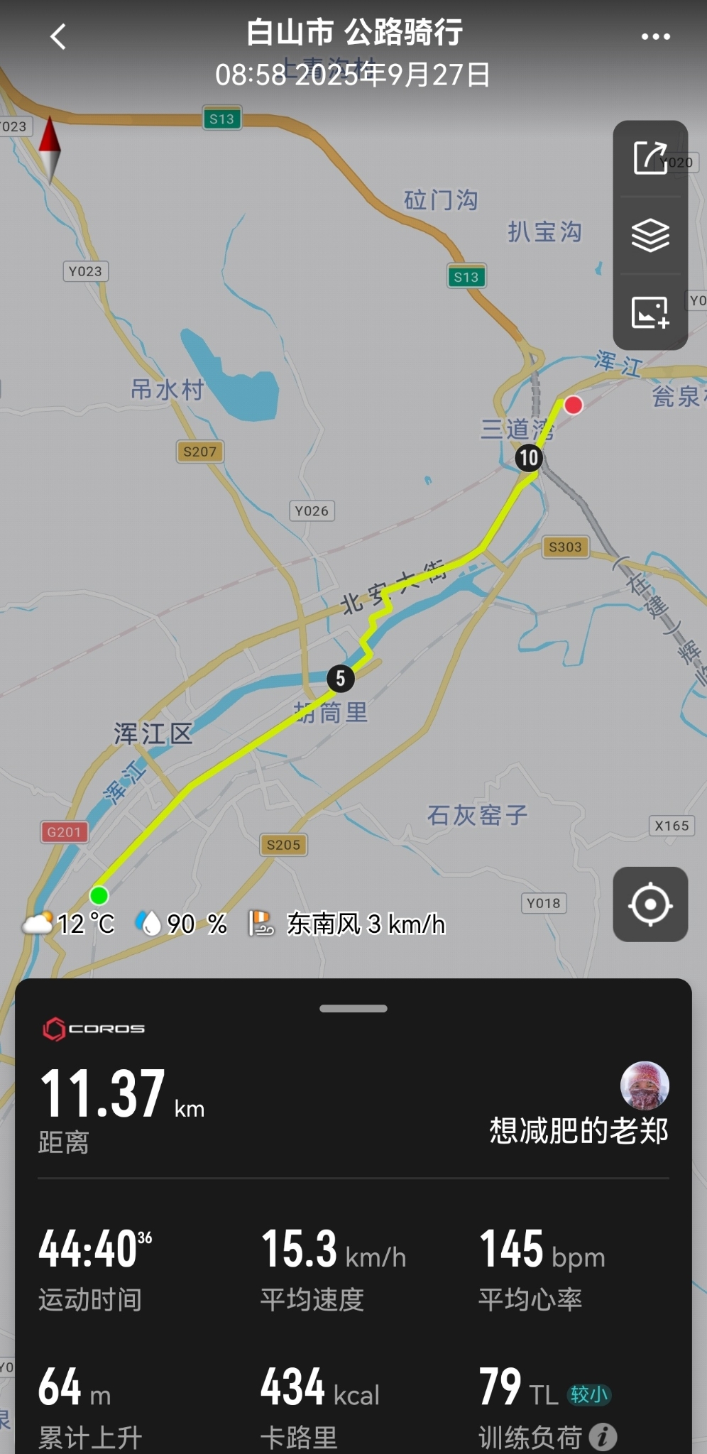 图为笔者和儿子从白山市区到白山东站的骑行轨迹。