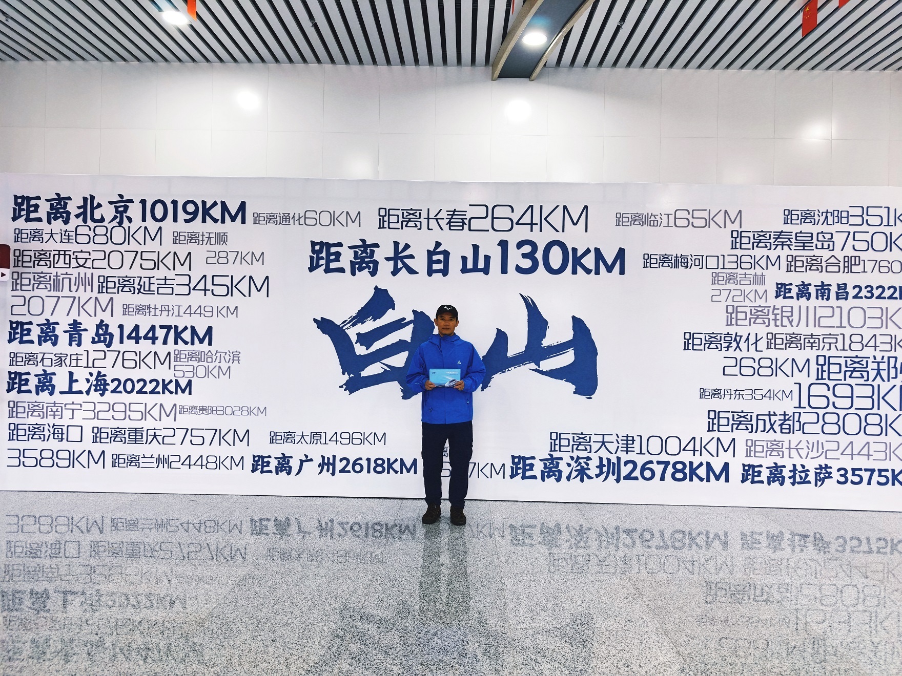 图为笔者在白山东站大厅内的留念。