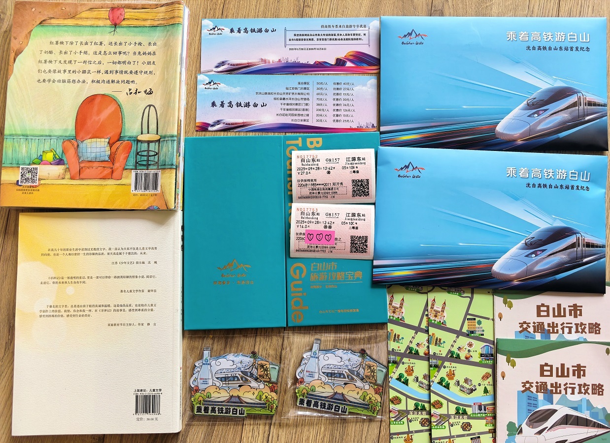 图为笔者儿子与白山东站的打卡照片。9月28日12:40,当双脚踏入沈白高铁的车厢,崭新的座椅、宽敞的空间瞬间让人眼前一亮。12:42,列车缓缓启动,继而呼啸向前,窗外的金秋盛景如流动的画卷:金黄的玉米田翻着浪,染红的枫叶缀满枝,远山含黛,近树含情,一切都在视野里快速铺展又轻轻掠过。车厢里没有喧嚣,只有旅客们难掩的激动——有人举着手机记录窗外的风景,有人轻声谈论着高铁开通的喜悦,橡果则趴在窗边,小手指着掠过的景物,眼中满是好奇与欢喜。出站后,还有幸收到文旅部门赠送的精美图书和印刷精良的“沈白高铁白山东站首发纪念封”,里面装着《白山市旅游攻略宝典》《白山市交通出行攻略》《白山市美食地图》《乘着高铁游白山专享优惠》、冰箱贴等惊喜文创礼物,真可谓诚意满满。走在宽敞明亮的高铁站大厅里,随处可见为了旅客出游而忙碌的安保、警察及志愿者们,突然想起了五年里那些曾栉风沐雨、攻坚克难,默默地辛勤修建这条铁路的工人们,真应该感谢让我们的生活越来越幸福的所有人。