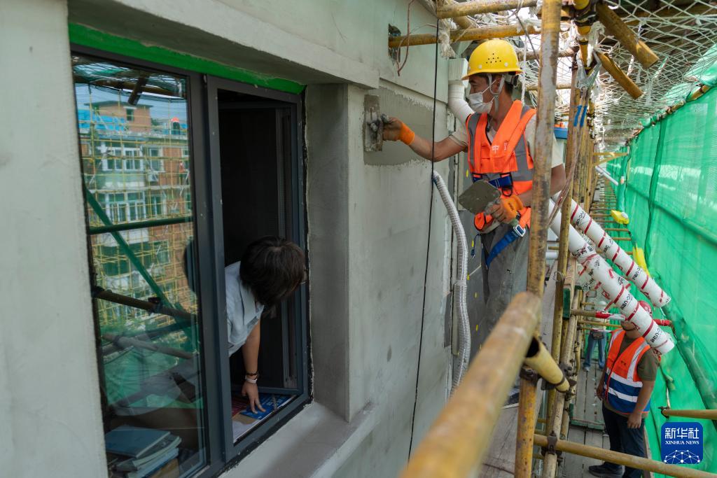 10月1日,在北京东城区和平里街道,中建三局集团有限公司工人进行外墙保温板抗裂砂浆施工。
