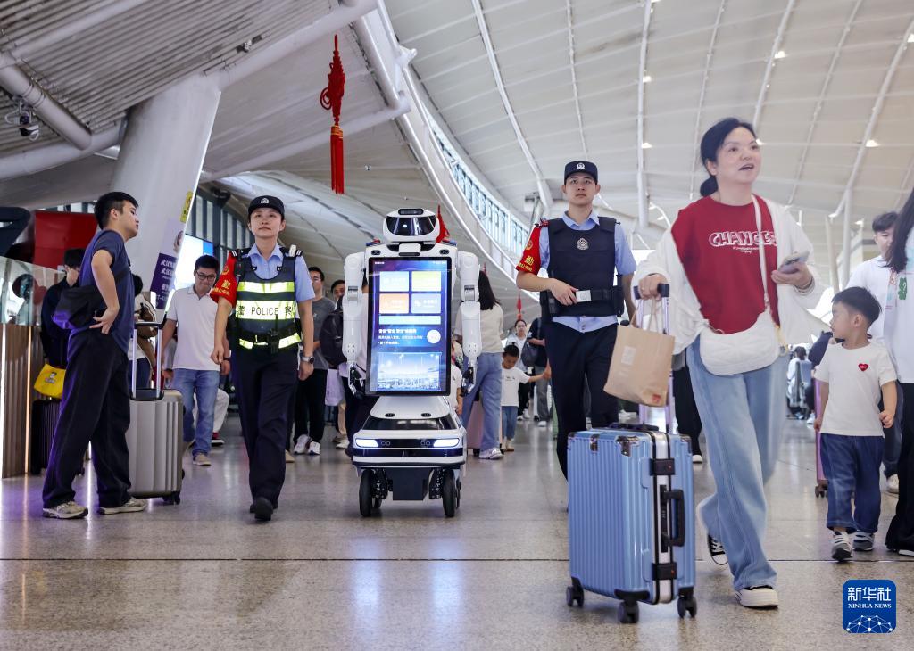 10月1日,武汉铁路公安处武汉站派出所民警在武汉站内巡逻。