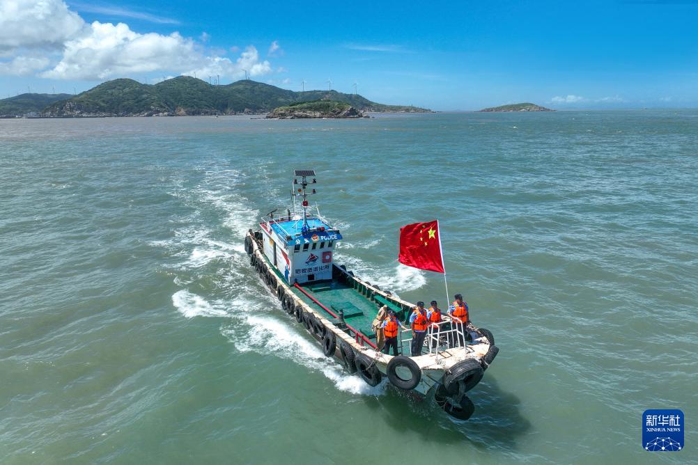 10月1日,浙江省舟山市岱山县公安局罗家岙派出所民警开展海上巡查(无人机照片)。