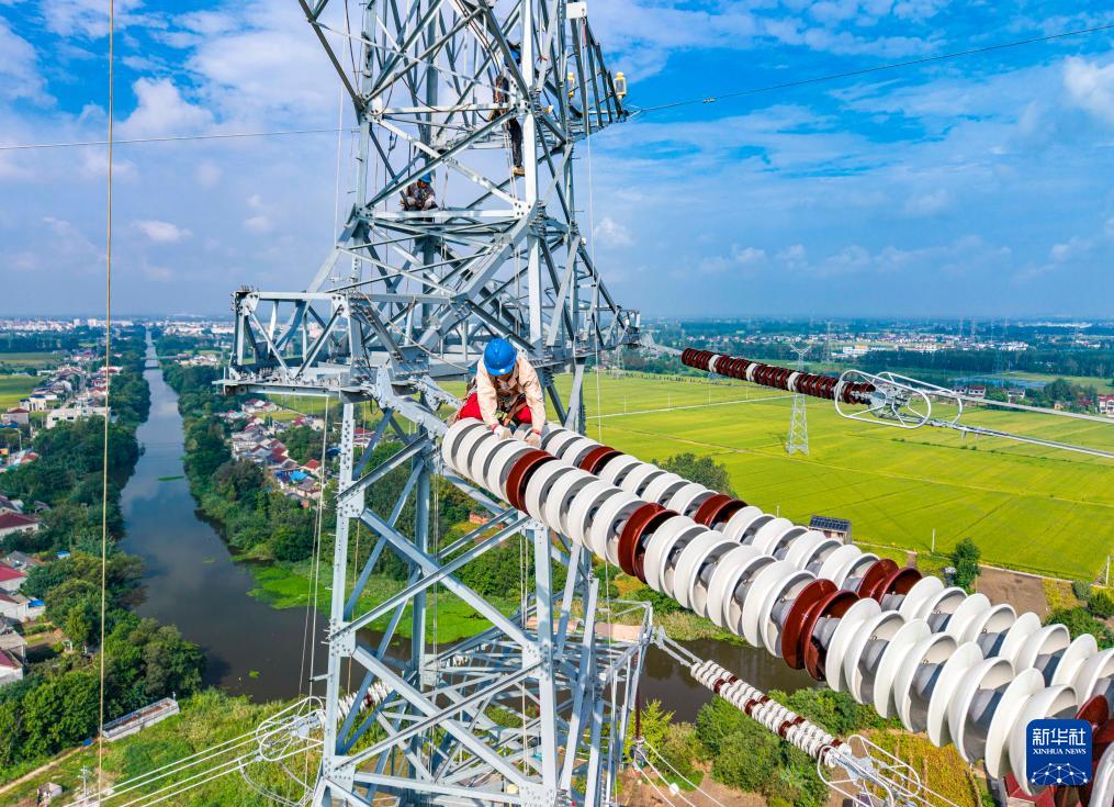 10月1日,在江苏省扬州市江都区吴桥镇,电力人员在扬州-镇江±200千伏直流输电二期工程施工现场作业(无人机照片)。