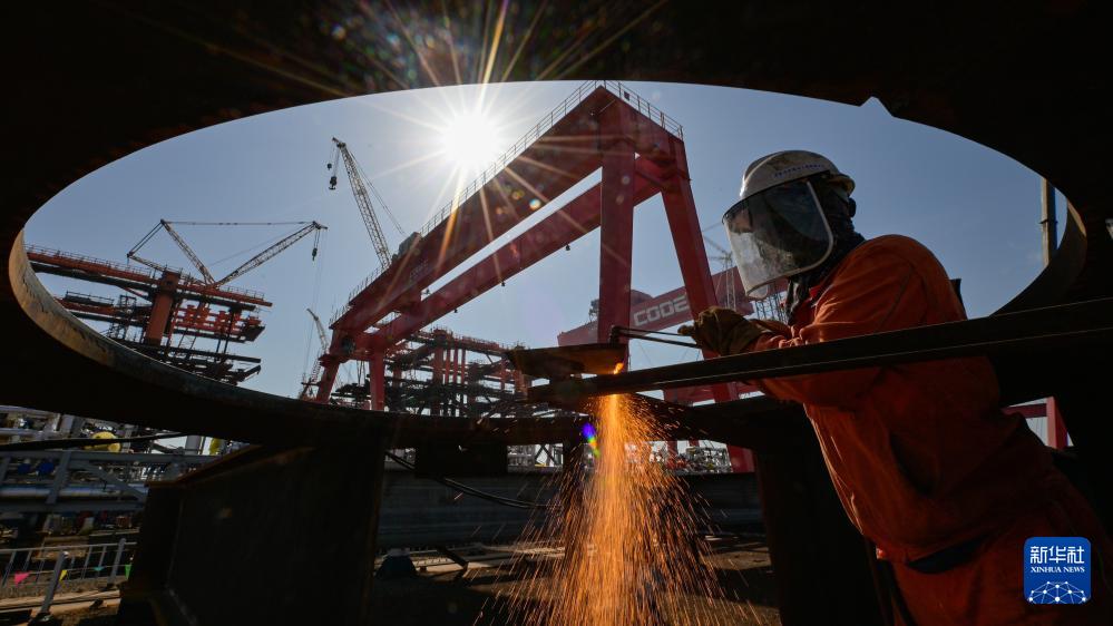 10月1日,在天津市滨海新区,渤海油田工人进行气割作业。