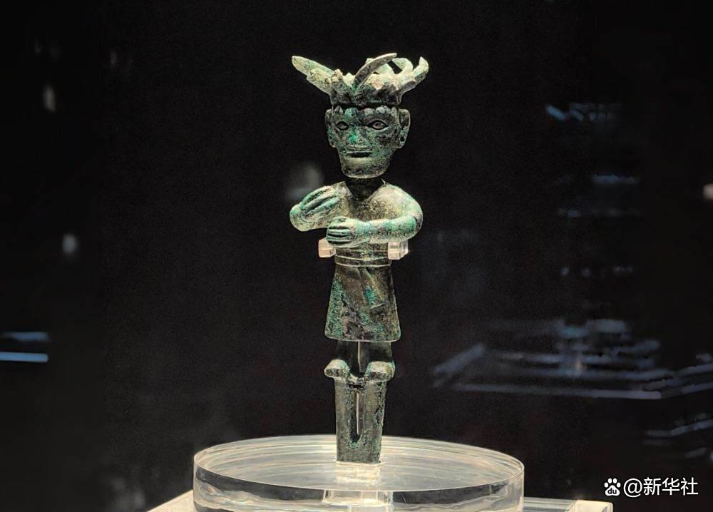 金沙遗址出土的铜立人,造型与三星堆青铜大立人相似(2025年4月9日摄)。三星堆遗址和金沙遗址都位于四川,距今约3600年至2800年,作为古蜀文明的两个中心遗址,共同勾勒出古蜀文明前后相继的辉煌图景,其出土文物是中华文明多元一体的生动例证。