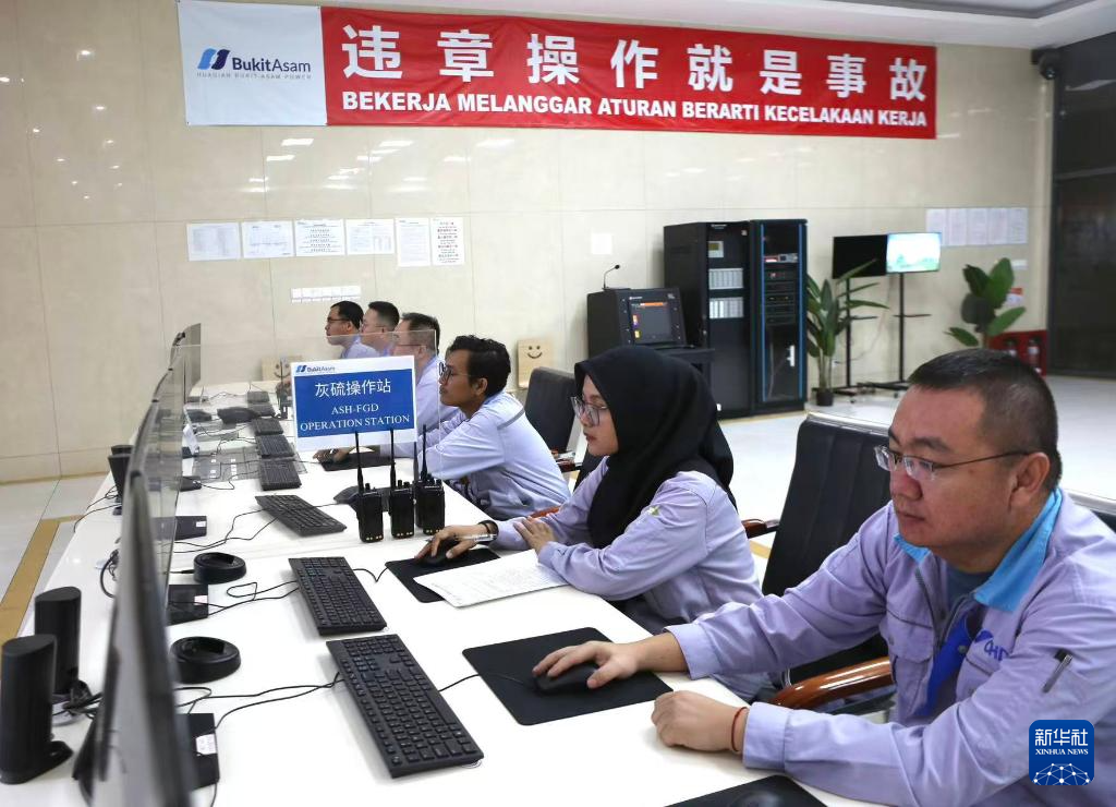 2025年10月3日,在位于印度尼西亚南苏门答腊省麻拉埃宁县的华电(印尼)玻雅发电公司集控室,中印尼员工正在认真工作。新华社记者 叶平凡 摄