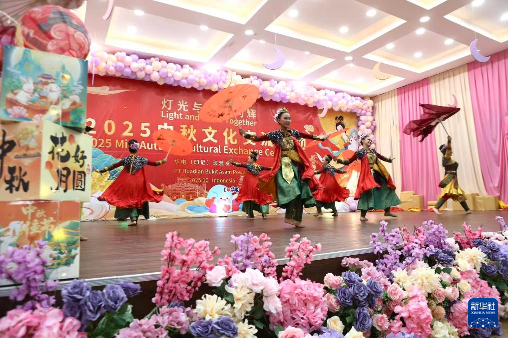 2025年10月3日,在位于印度尼西亚南苏门答腊省麻拉埃宁县的华电(印尼)玻雅发电公司电厂文体活动中心举行的中秋文化交流活动上,女员工正在表演舞蹈。新华社记者 叶平凡 摄