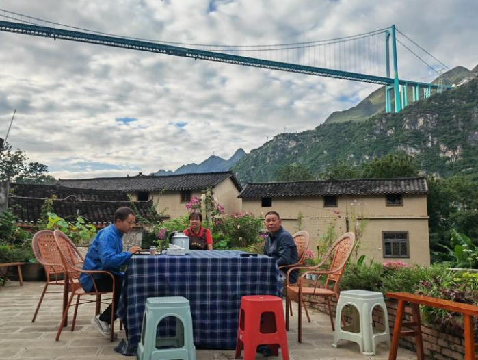 2025年9月27日,在贵州花江峡谷大桥附近,林国权(左)在自家民宿和员工坐在一起交流。新华社记者 向定杰 摄