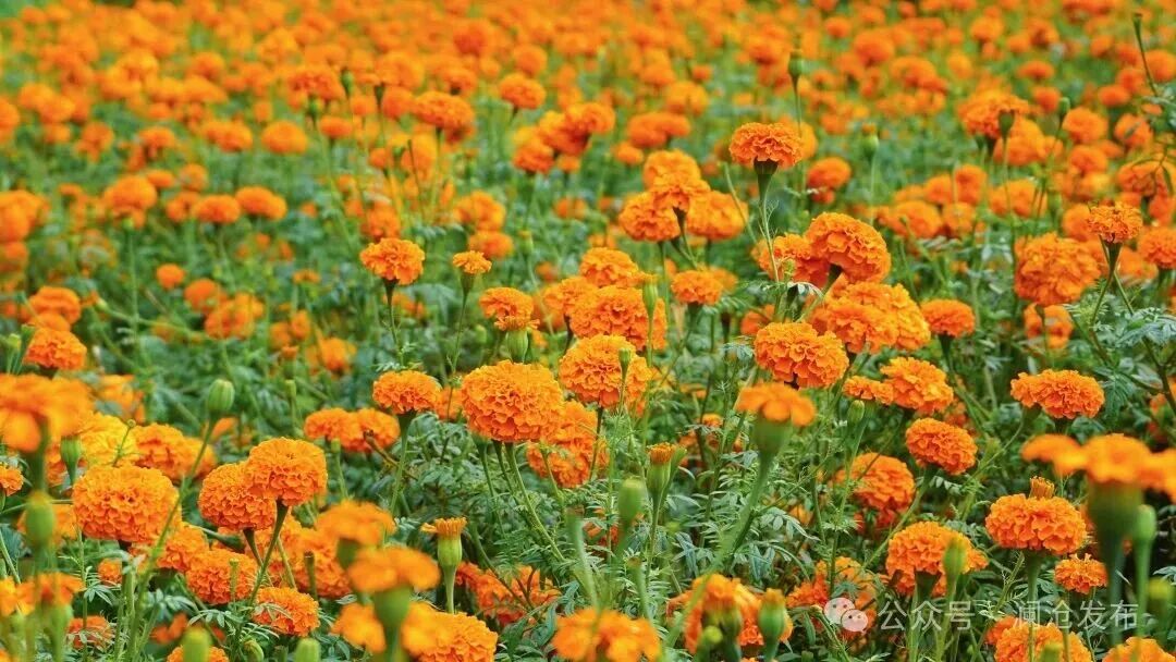 花田间,农户们手法娴熟地采摘饱满花盘,笑容如花朵般绽放,这抹金色,不只为大地添彩,更承载着产业的希望,采摘后的万寿菊被送入加工车间,提取天然色素、精油与保健品,从田间走向更广阔的市场。