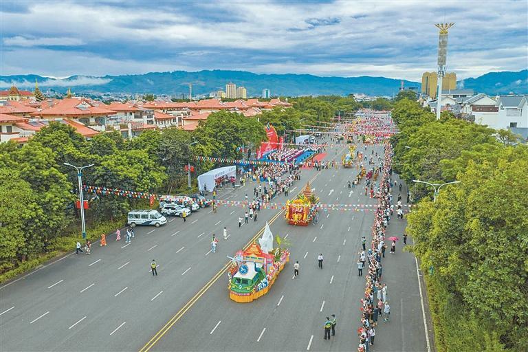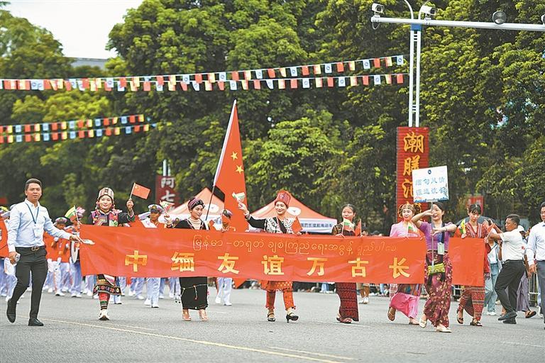 “开发开放是共同的追求,胞波相聚是跨越国界的约定。”巡游首章“五彩纷呈庆胞波”中,中缅主题彩车率先驶来,揭开了这场狂欢的时代注脚。中国德宏彩车以“沿边开放、产业兴边”为魂,浓缩着2024年对缅贸易额突破300亿元、带动10万群众增收的奋进历程;缅甸木姐彩车则以古老佛塔与“中缅友谊万古长青”字样,诉说着两国山水相连、民心相通的纽带。