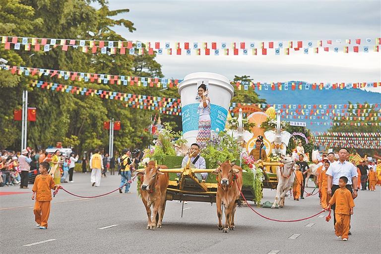 随着20辆牛车依次出场,巡游活动迎来了围观群众的一阵阵欢呼,大家纷纷举起手机拍照留念。参加巡游的牛车从“瑞丽咖啡”的百年种源香,到“瑞丽柠檬”“蜜柚”的果香漫山;从冬季鲜食玉米的“黄金单品”,到纺织服装的传统与现代交织……每辆牛车都是德宏与缅甸产业共荣的切片。当载着中缅农商产业园图景的牛车驶过,人群中爆发出欢呼——这是两国农业合作从“通道”到“落地”的见证;而闽商、湘商主题牛车,则勾勒出八方商客扎根边疆、共建家园的生动图景。