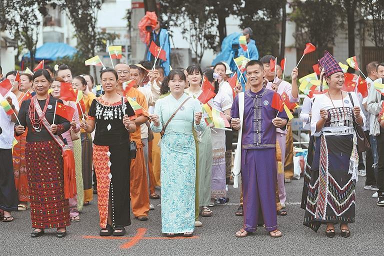 10月2日上午,中缅边境的瑞丽江边广场沸腾如潮,一场民族风情巡游点燃了第二十届中缅胞波狂欢节的节日氛围。这场跨越国界的盛会,让数万名中缅边民聚集在瑞丽江边广场上,用最炽热的舞步、最鲜活的产业故事、最滚烫的文化共鸣,共织美丽画卷,共贺中缅建交75周年,续写“同饮一江水、共话一家亲”的胞波传奇。